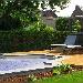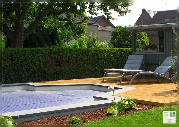 Grenzt der Pool direkt an eine Holzterrasse, muss diese aus besonderen Hölzern gefertigt sein, um Verschmutzungen durch Ausbluten der Hölzer zu vermeiden. Grenzt der Naturstein direkt an einen Pool, muss dieser den chemischen Belastungen standhalten.